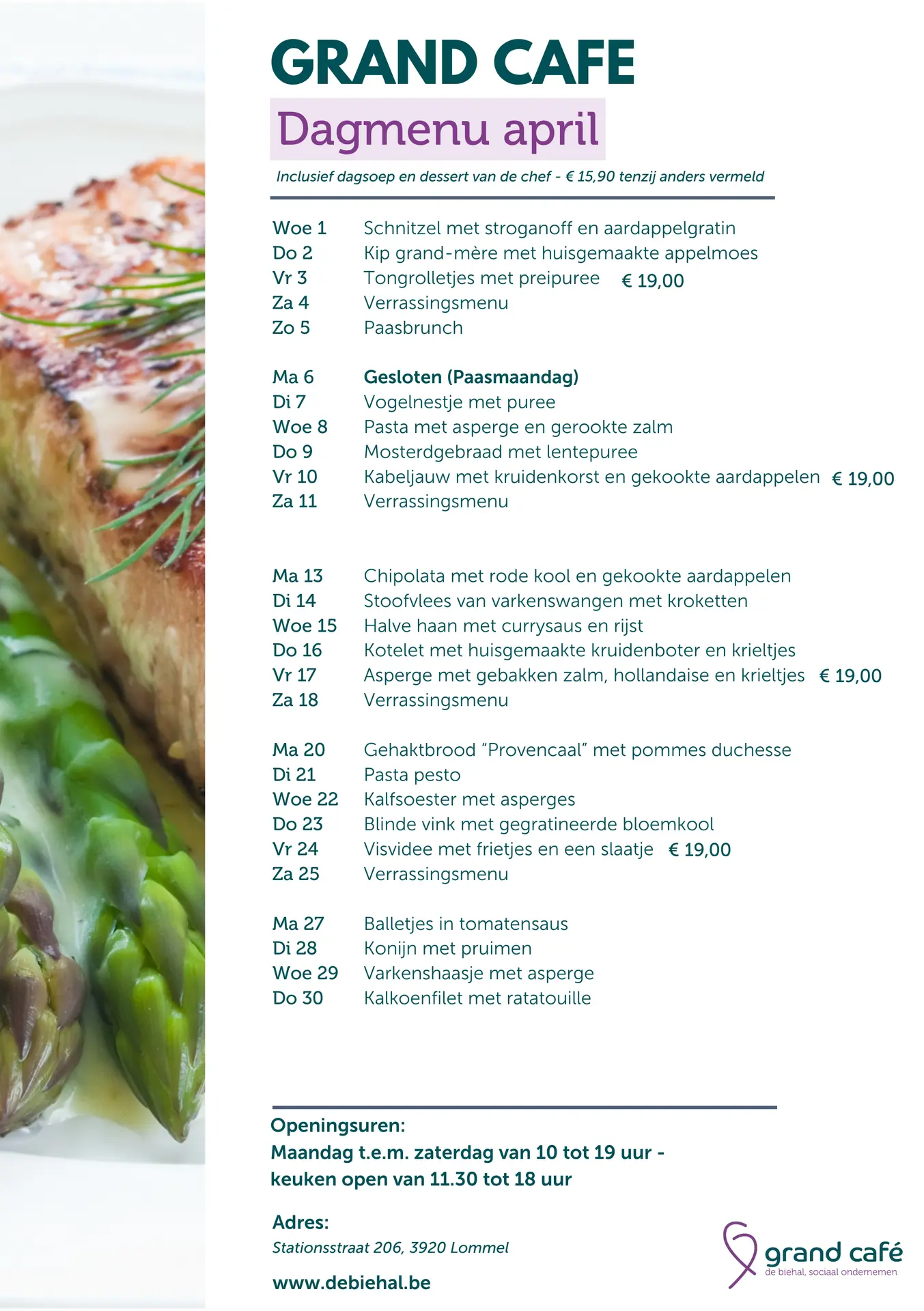 Bij specialere dagmenu's verhoogt de prijs naar € 19,00 p.p. (wordt steeds extra vermeld).