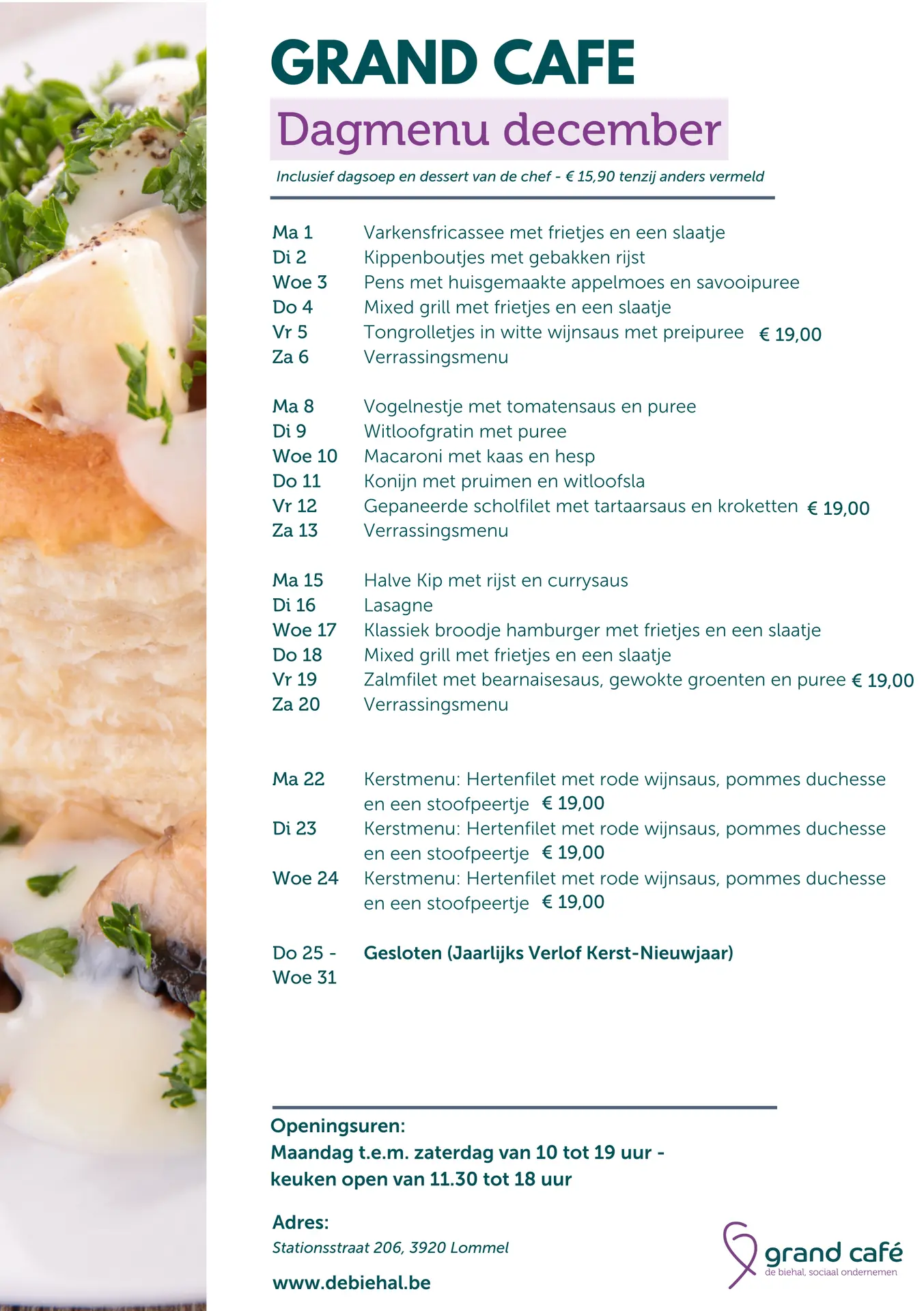 Bij specialere dagmenu's verhoogt de prijs naar € 19,00 p.p. (wordt steeds apart vermeld als 'luxemenu').