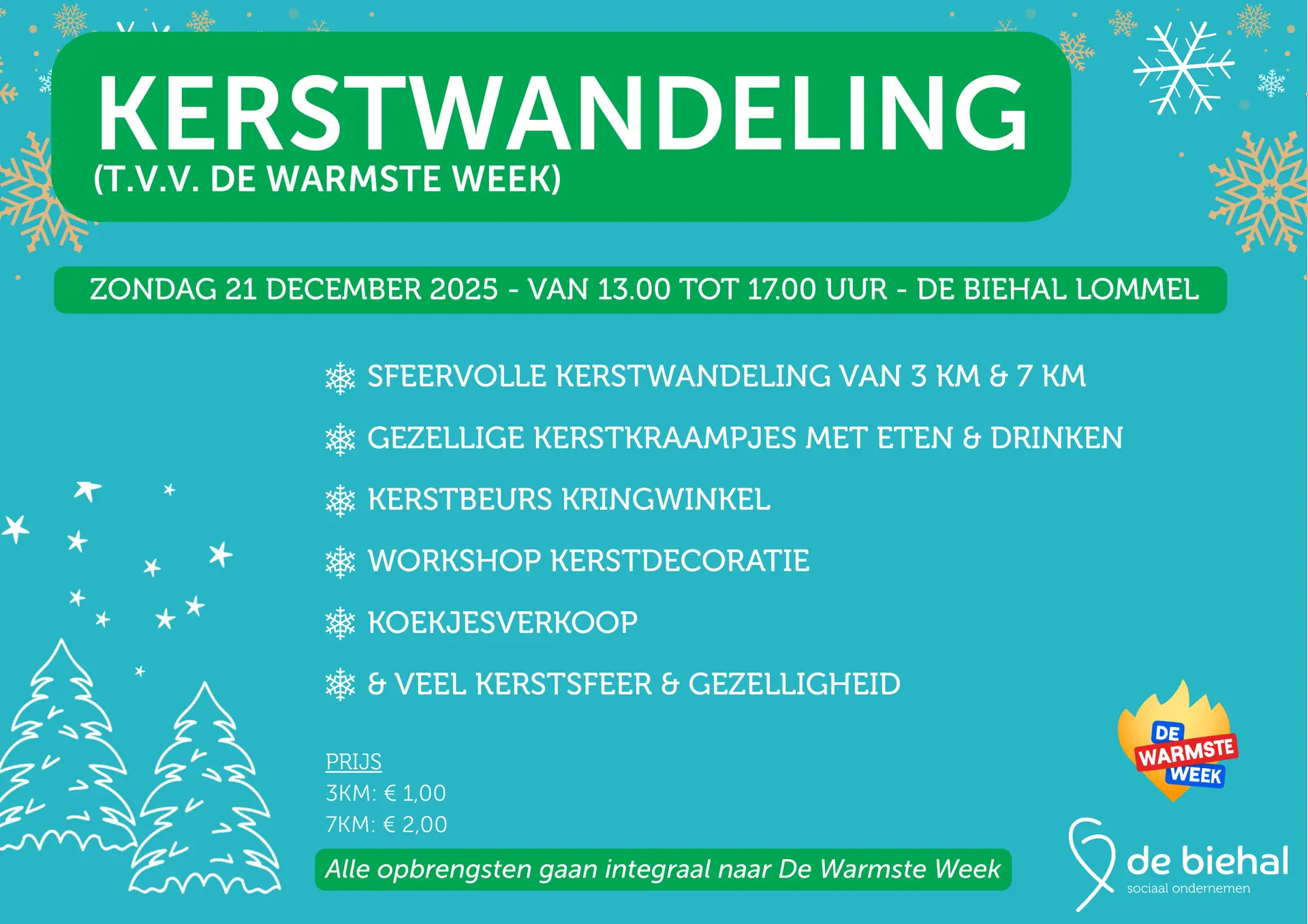 Zondag 21 december wordt de Biehal de gezelligste en warmste plek in Lommel. We organiseren dan een sfeervolle kerstwandeling van 3 of 7 km ten voordele van de Warmste Week.