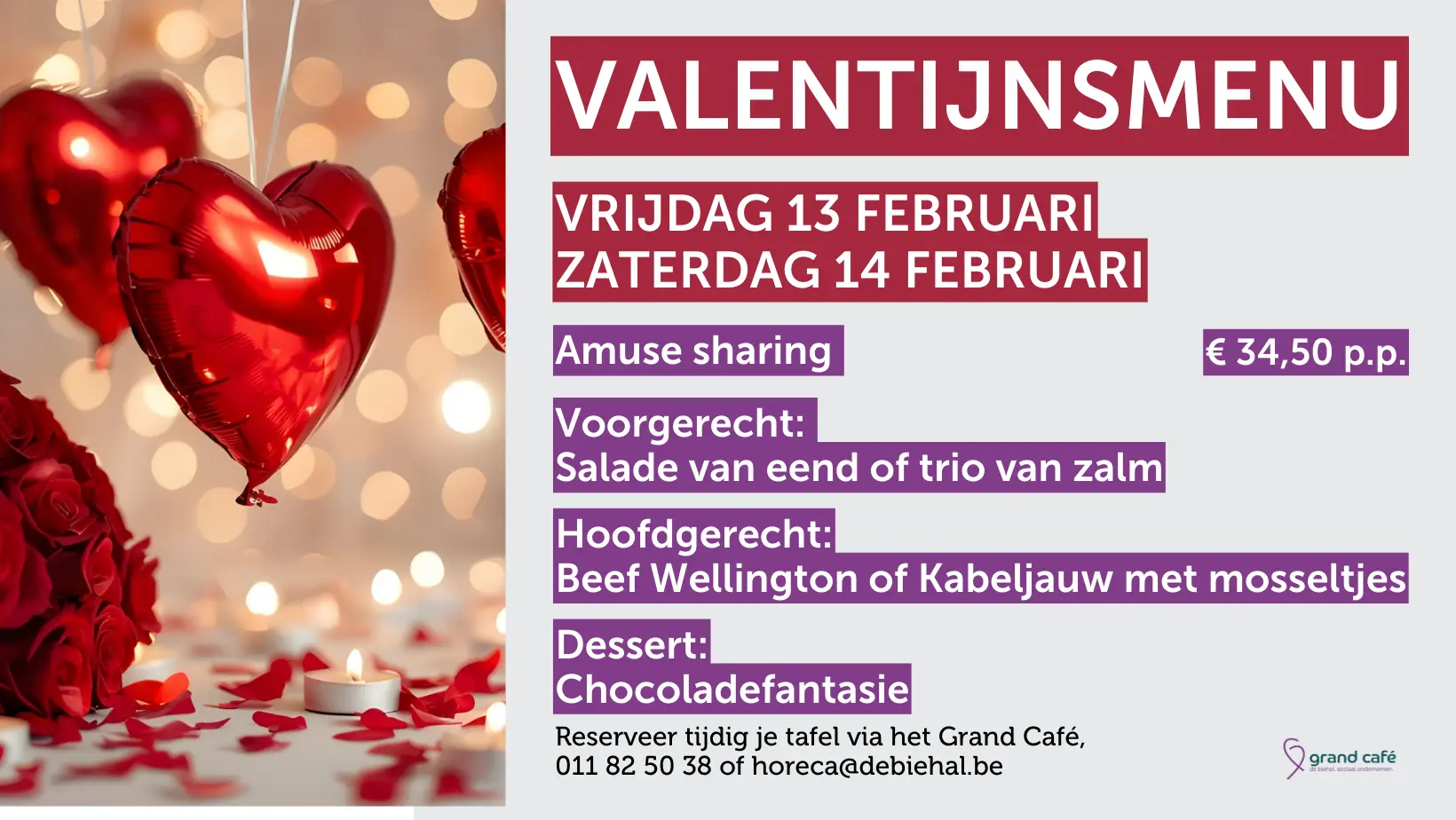 Vrijdag 13 en zaterdag 14 februari bieden we in ons Grand Café de Biehal een heerlijk Valentijnsmenu aan.