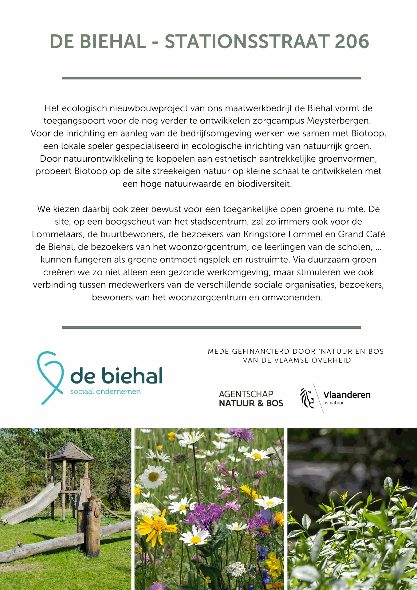 Het ecologisch nieuwbouwproject van ons maatwerkbedrijf de Biehal vormt de toegangspoort voor de nog verder te ontwikkelen zorgcampus Meysterbergen. Voor de inrichting en aanleg van de bedrijfsomgeving werken we samen met Biotoop, een lokale speler gespecialiseerd in ecologische inrichting van natuurrijk groen. Door natuurontwikkeling te koppelen aan esthetisch aantrekkelijke groenvormen, probeert Biotoop op de site streekeigen natuur op kleine schaal te ontwikkelen met een hoge natuurwaarde en biodiversiteit.