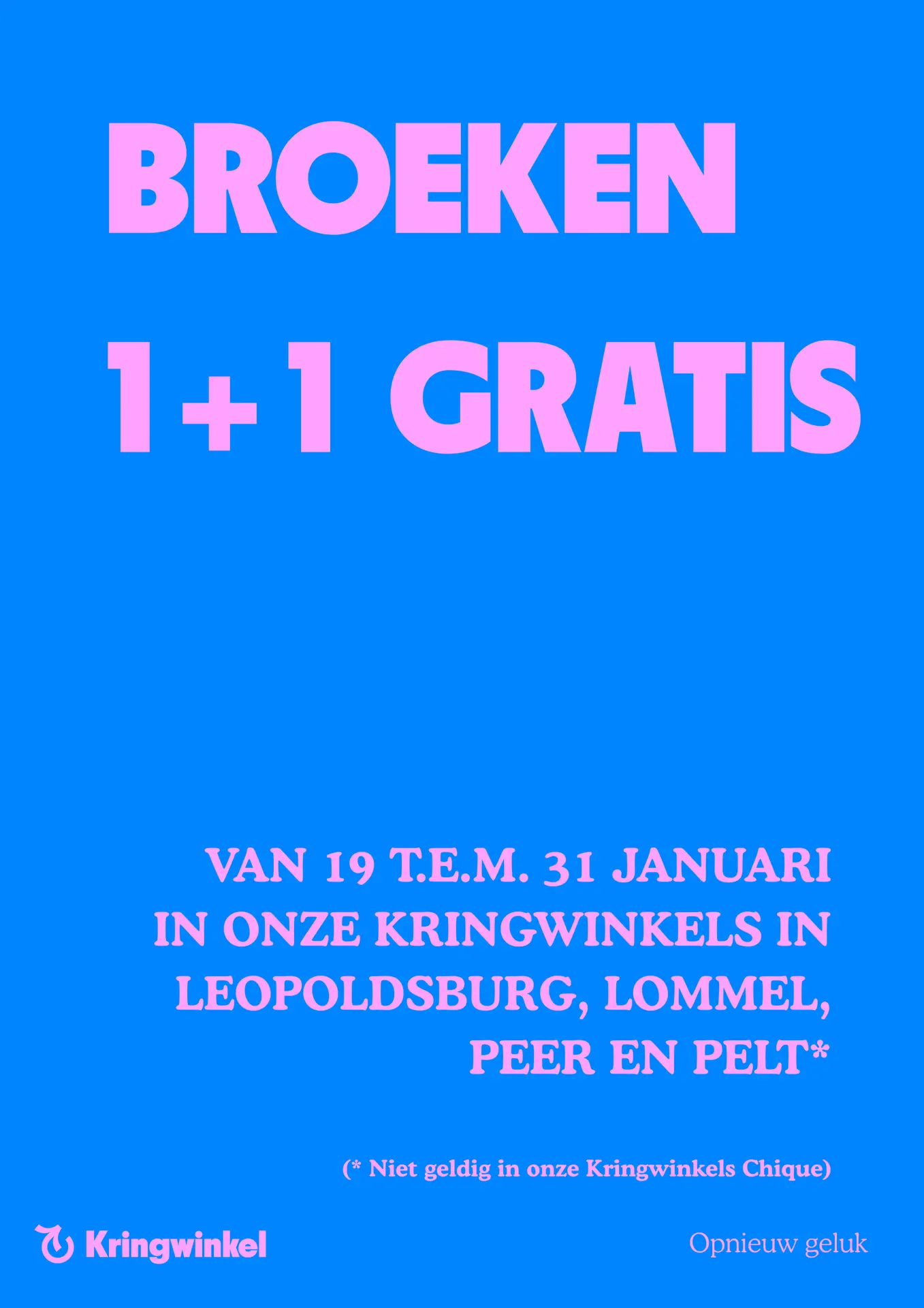 Vanaf 19 januari kan je terecht in al onze Kringwinkels terecht voor onze 1+1 gratis actie. Bij aankoop van 1 broek een tweede broek gratis. Let op: niet geldig in onze Kringwinkels Chique.