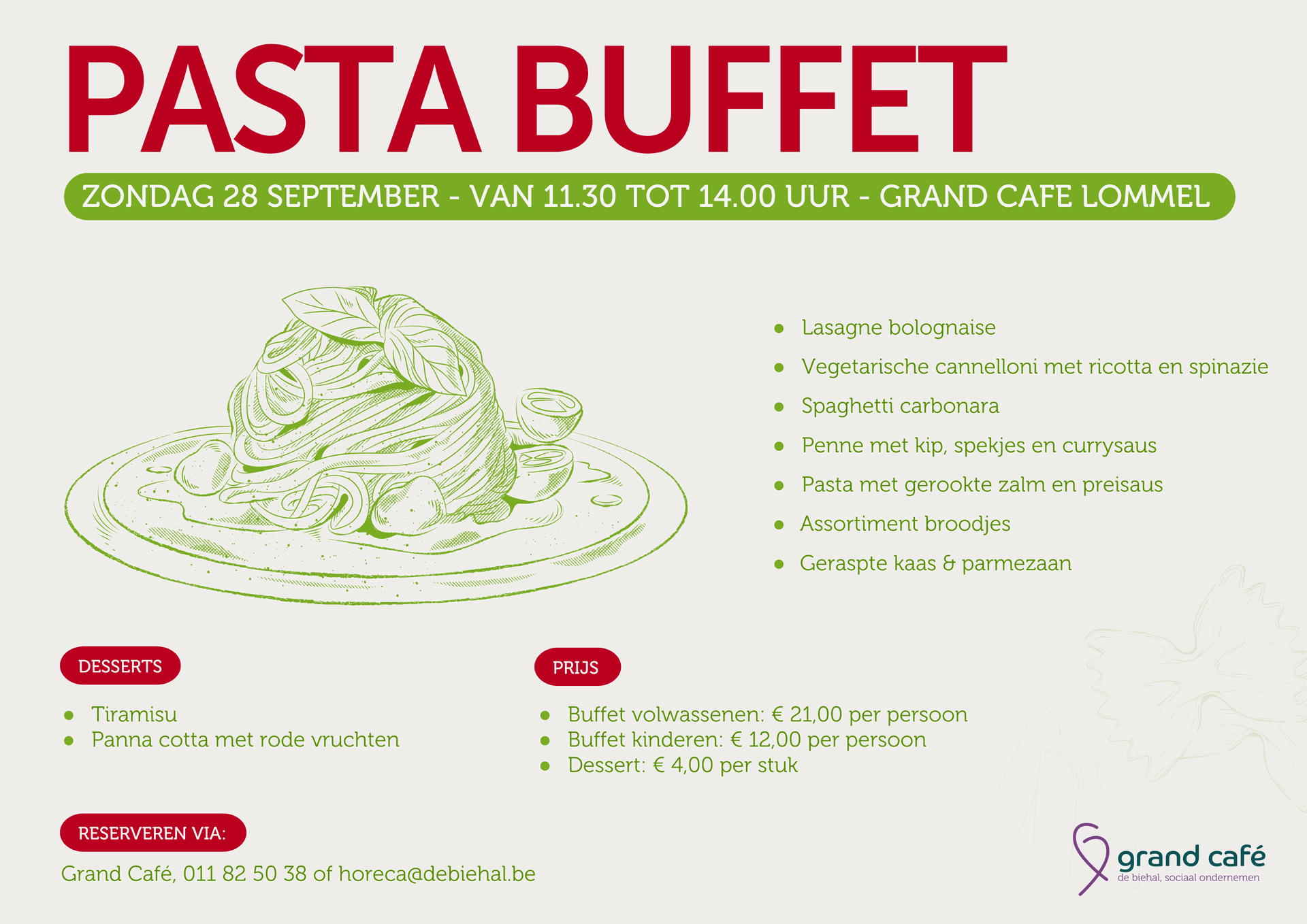 Op zondag 28 september opent het Grand Café in Lommel haar deuren tussen 11.30 en 14.00 uur voor een uitgebreid pastabuffet.